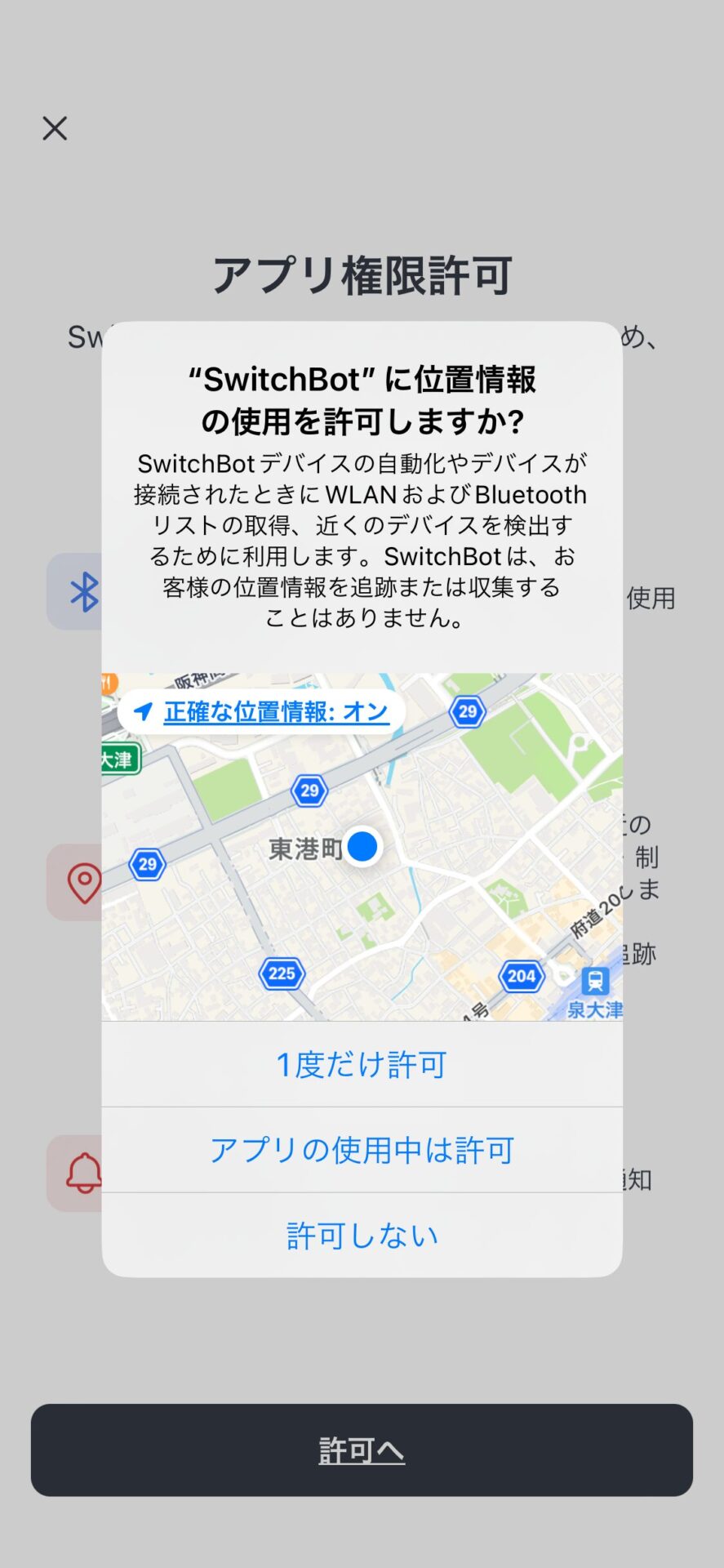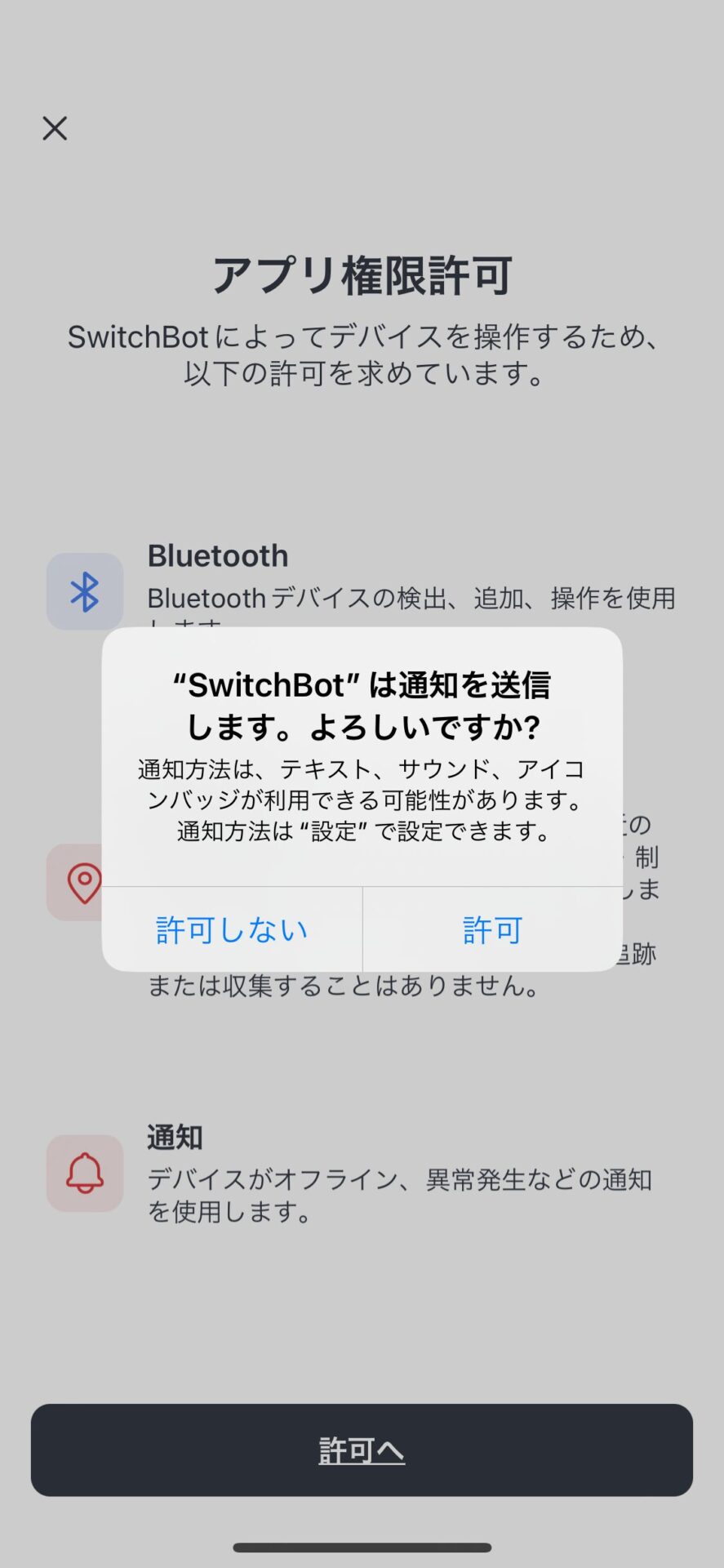 “SwitchBot” に位置情報の使用を許可しますか?と聞かれます。