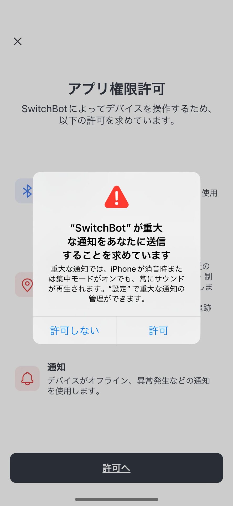 “SwitchBot” が重大な通知をあなたに送信することを求めていますと聞かれます。