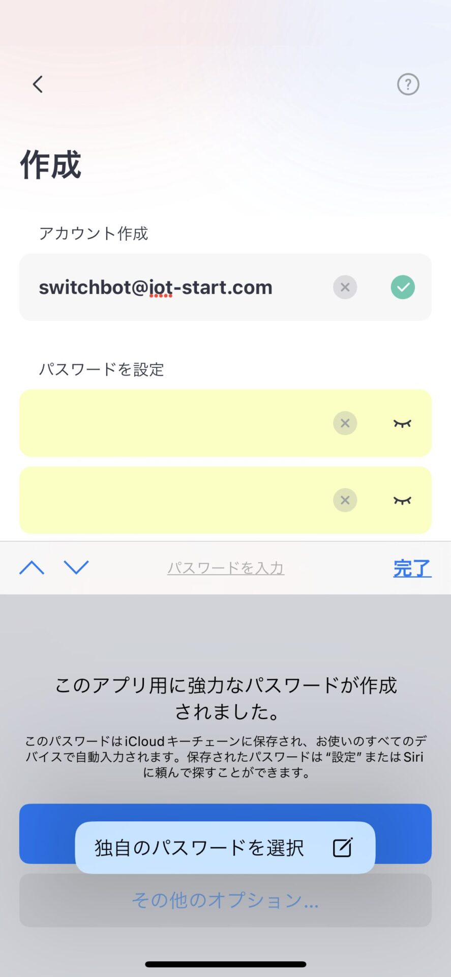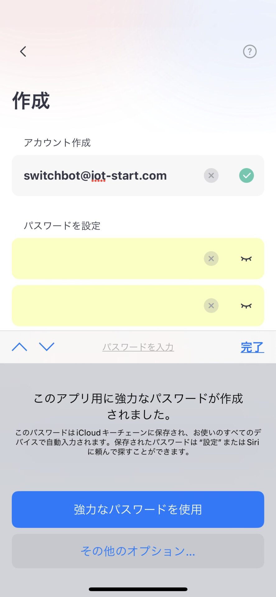 iPhone でパスワードを管理したい場合はパスワードボックスが黄色くなり iPhone が用意したパスワードが表示されます。