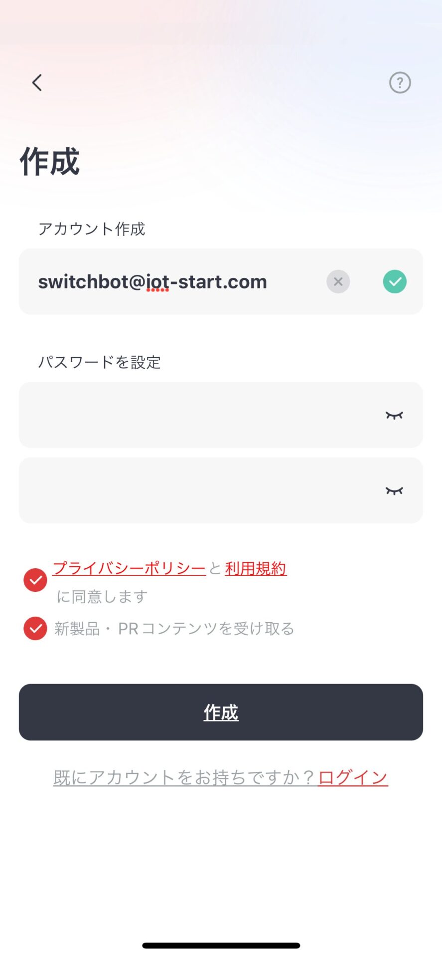 これは登録したメールアドレス宛に新製品の情報やスイッチボットシリーズの PR コンテンツが送られてきますので、必要のない方は赤い丸チェックをタッチしてチェックのない白い丸にしておいてください。
